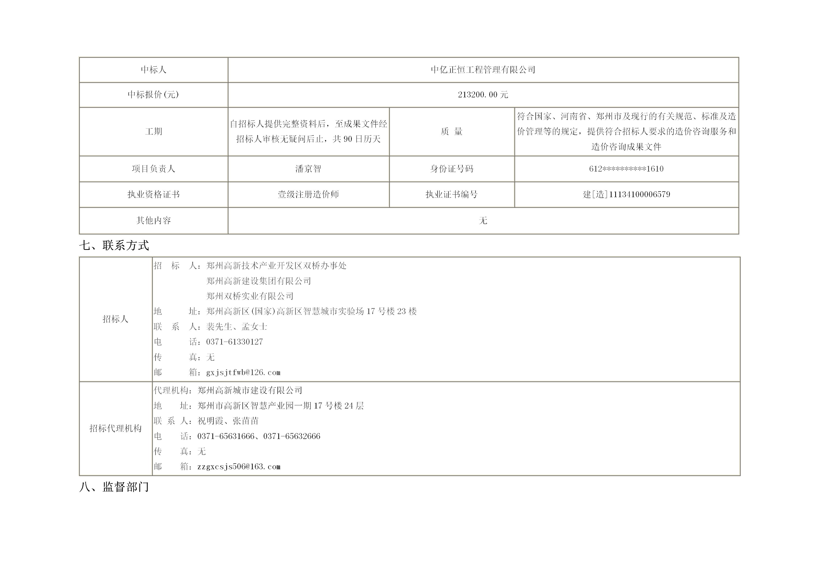 鄭州高新區(qū)連霍以北合村并城項(xiàng)目清算造價(jià)咨詢(xún)服務(wù)一標(biāo)段中標(biāo)結(jié)果公告
